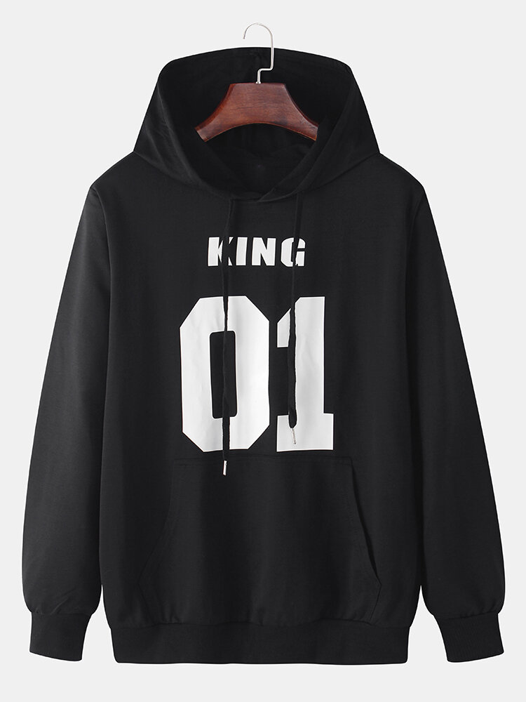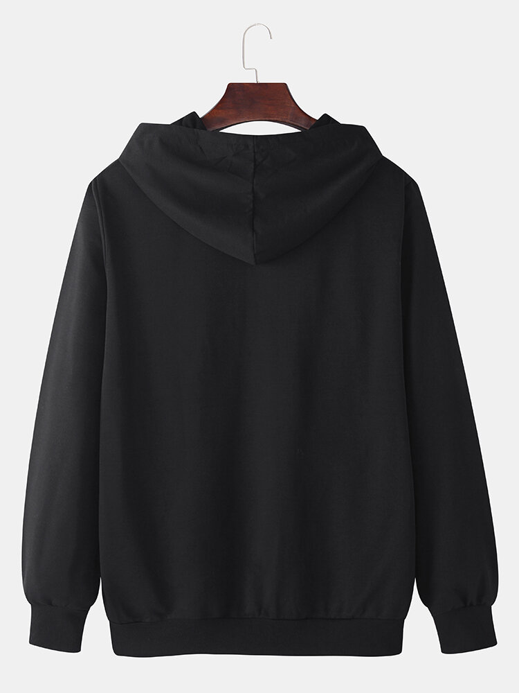 Mens Cotton Number Print Solid Color Daily Drawstring Pullover Hoodies – Black M