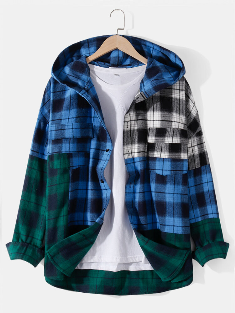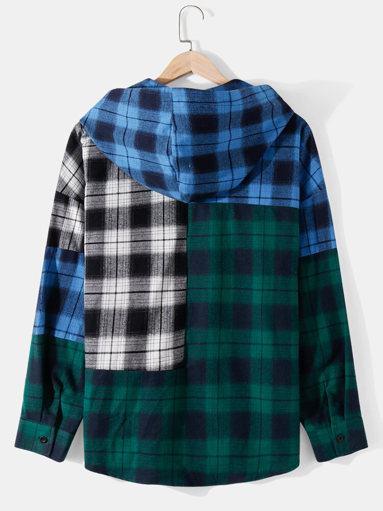 Mens Cotton Patchwork Plaid Chest Pocket Hooded Shirts – Green S