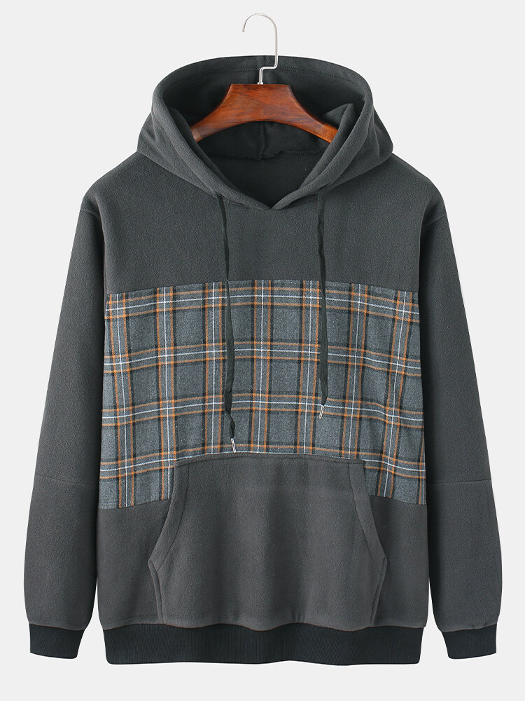 Mens Cotton Patchwork Tartan Check Long Sleeve Casual Drawstring Hoodies With Kangaroo Pocket – Dark Grey 2XL