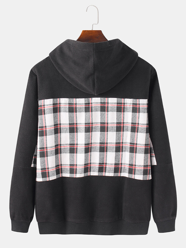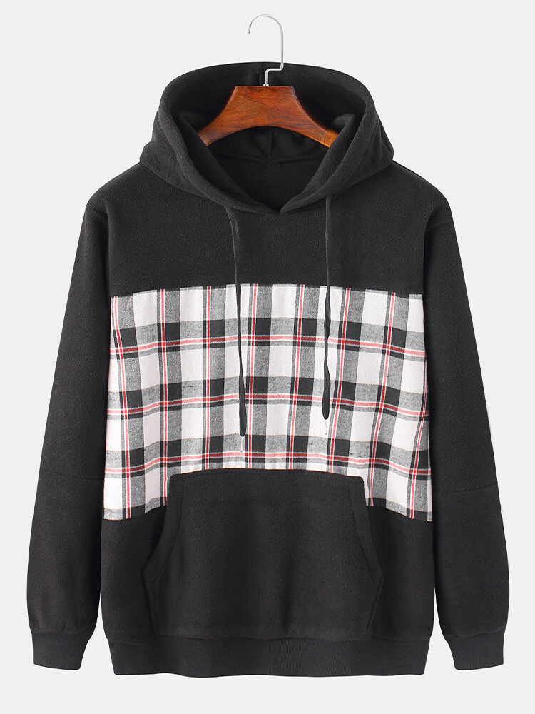 Mens Cotton Plaid Patchwork Black Kangaroo Pocket Design Long Sleeve Hoodies – Black M