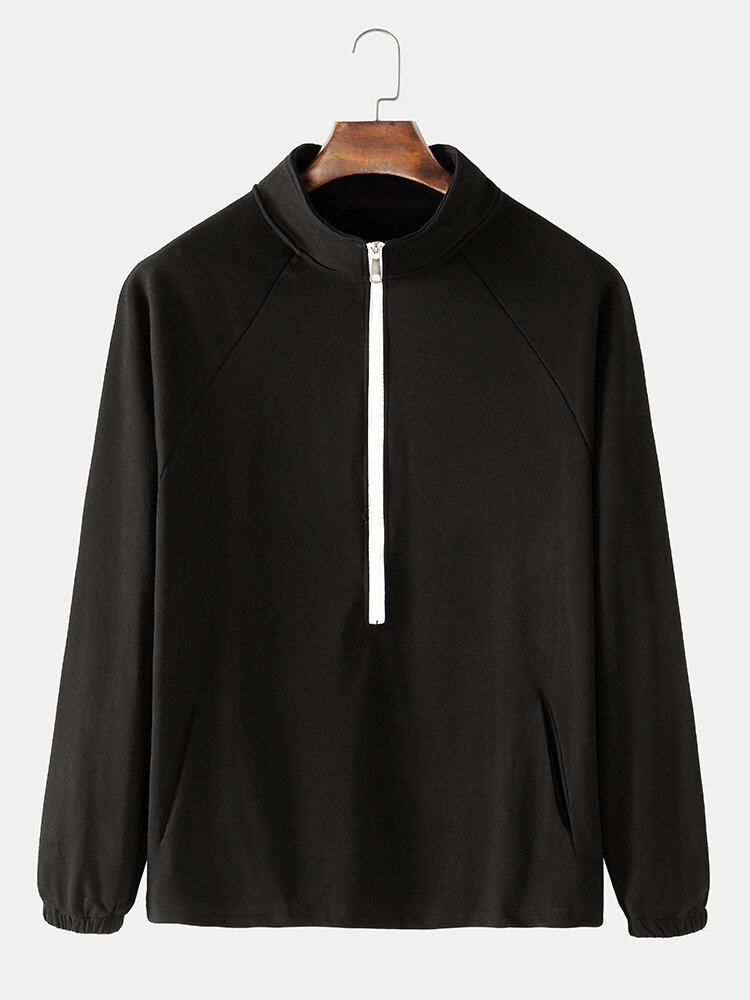Mens Cotton Solid Color Half Zipper Raglan Sleeves Design Henley Shirts With Pocket – Black S