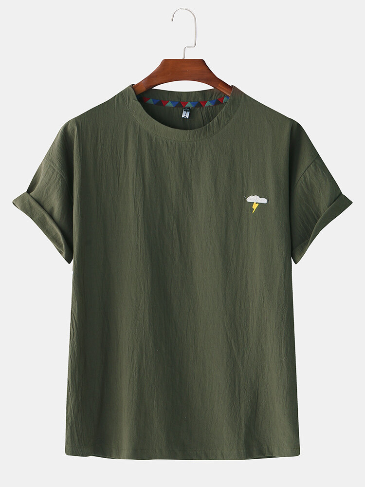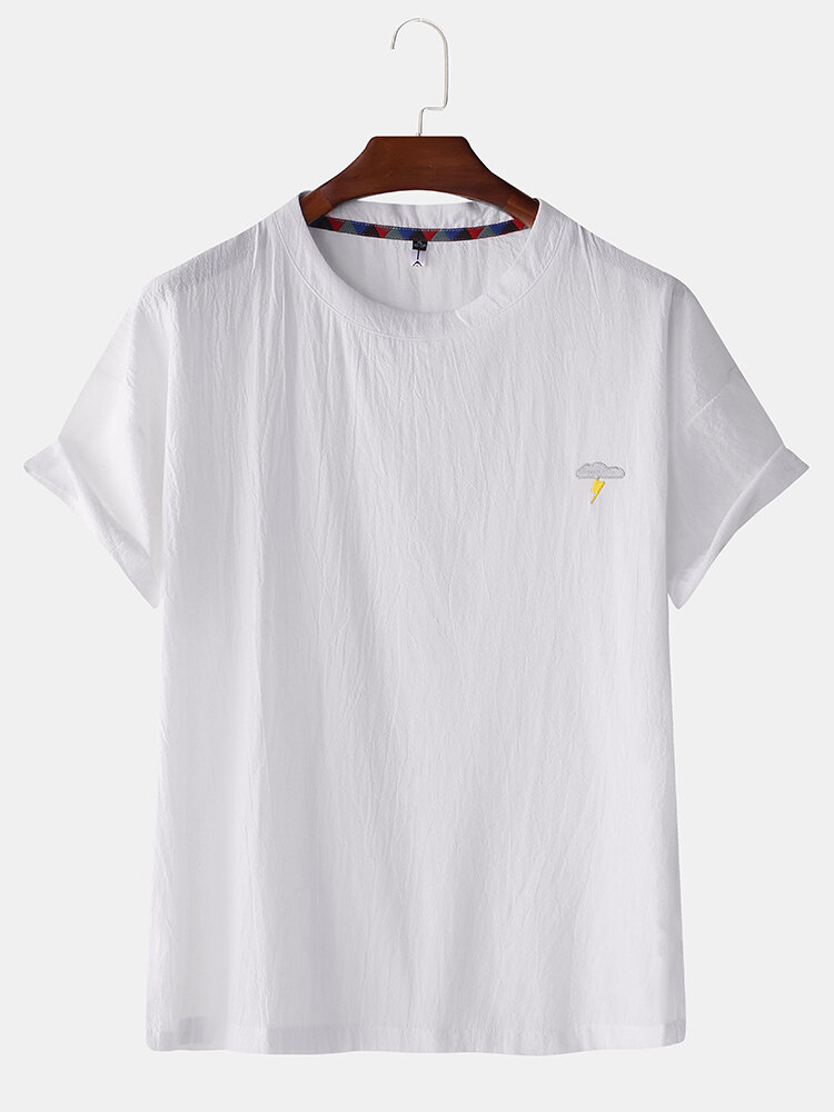 Mens Cotton Solid Color Little Cloud Embroidery Short Sleeve Casual T-Shirts – White L