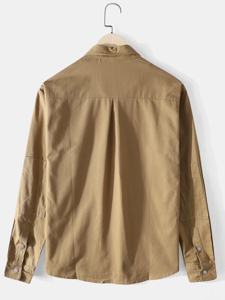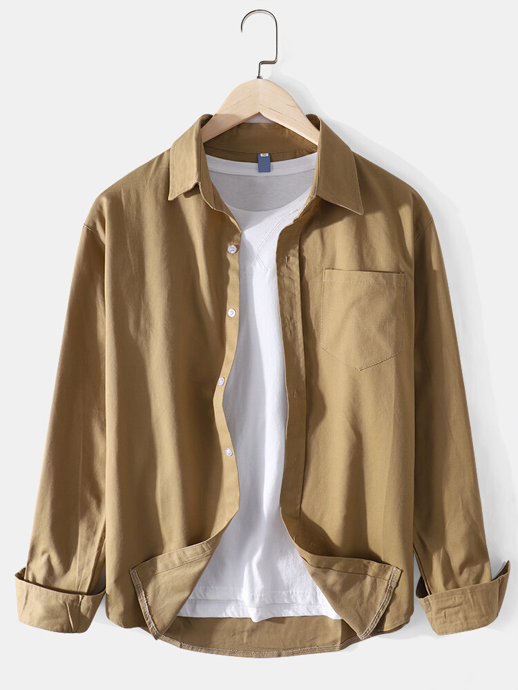 Mens Cotton Solid Color Pocket Button Up Long Sleeve Simple Shirts – White M