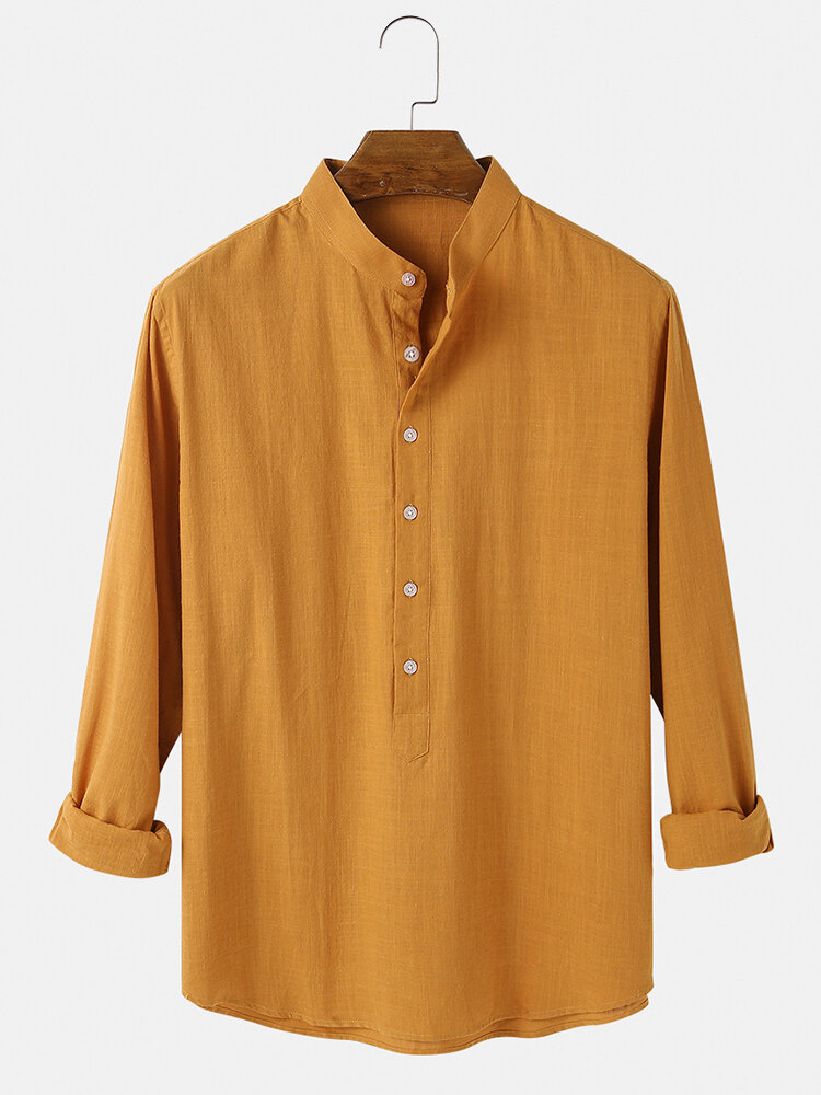 Mens Cotton Stand Collar Half Collar Solid Color Long Sleeve Casual Shirts – White S