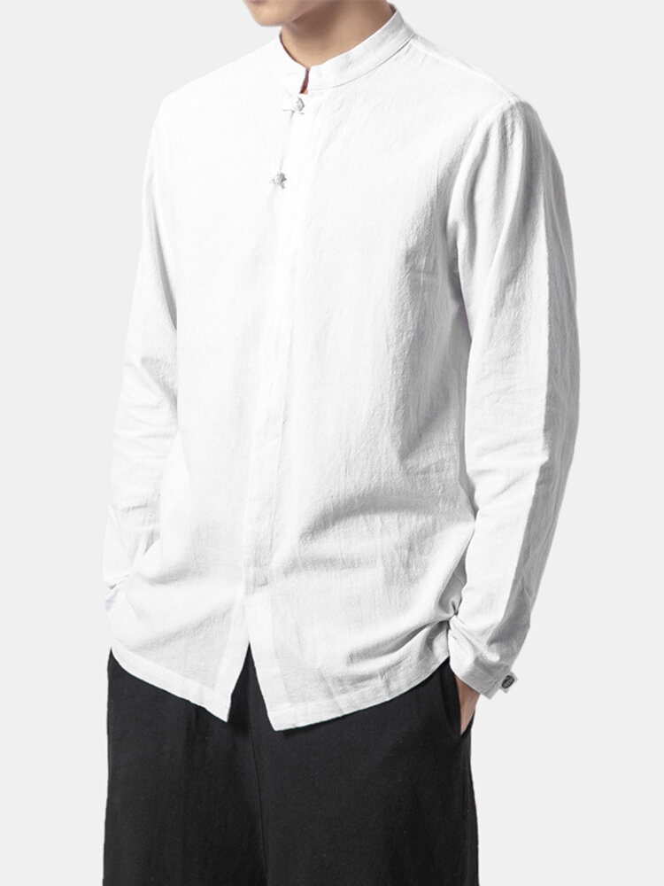 Mens Cotton Stand Collar Pure Color Casual Shirts – XL White