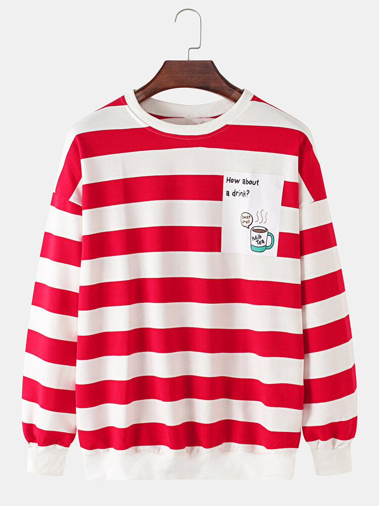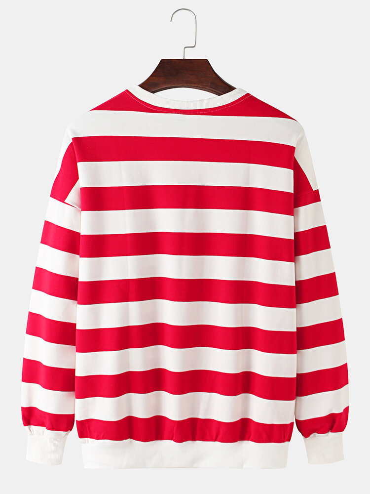 Mens Cotton Stripe & Letter Print Print Pullover Drop Shoulder Long Sleeve Sweatshirts – Black 3XL