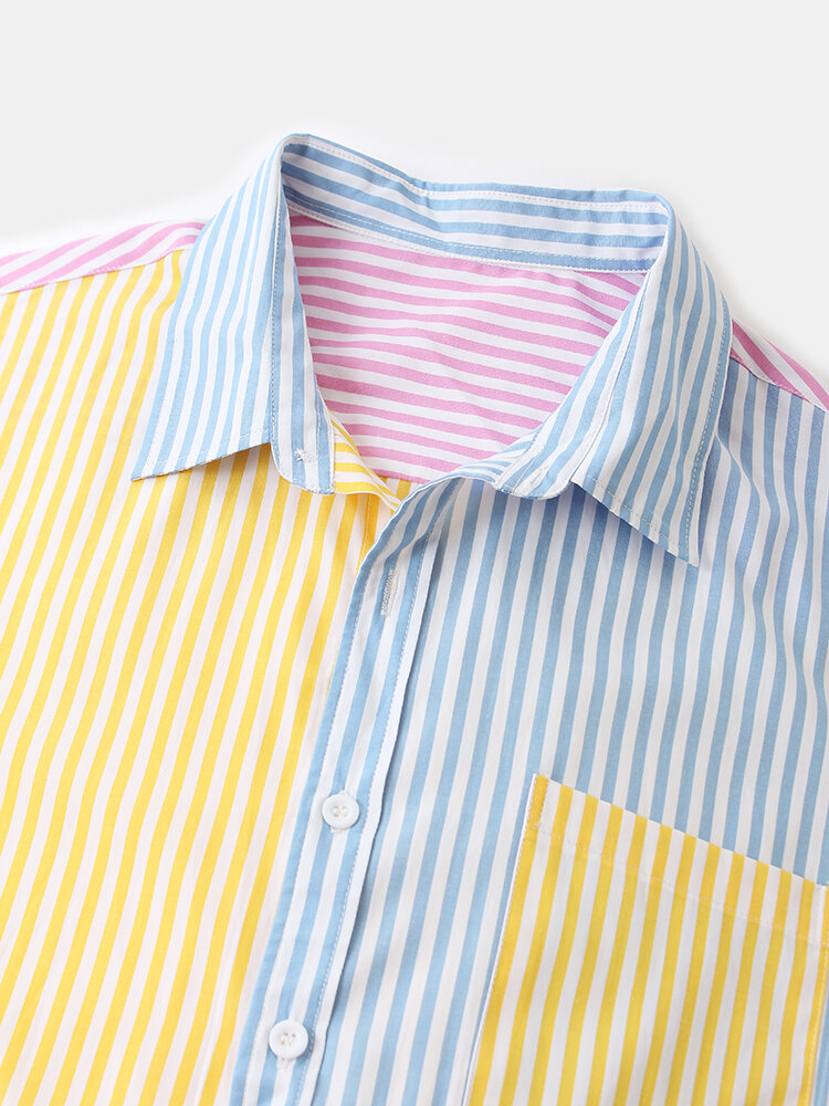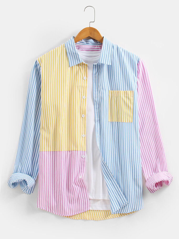 Mens Cotton Stripe Patchwork Button Up Pocket Lapel Long Sleeve Shirts – Yellow S