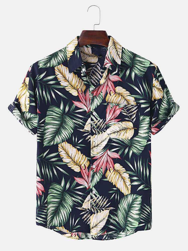 Mens Cotton Tropical Plant Leaves Print Turn Down Collar Hawaii Holiday Short Sleeve Shirts – Navy 2XL