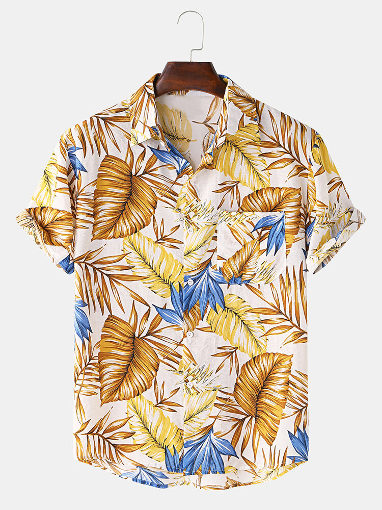 ?Item Type:ShirtPattern Type:PrintGender: MenFit Type: FitStyle: Casual,Fashion,HolidayThickness: RegularCollar: Turn Down CollarSeason: SummerDecorations: PocketMaterial:CottonSleeve Length: Short Sleeve Color: Yellow,NavyCuff Type: Straight SleevesOccasion: Leisure,Home,Daylife,Beach