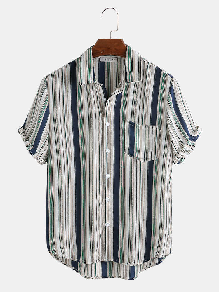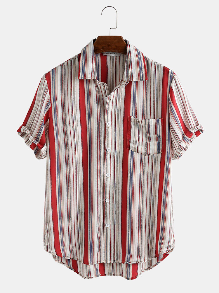 Item Type: ShirtsPattern Type: StripeGender: Men Fit Type: FitStyle: Casual,Fashion Thickness: RegularCollar: Turn Down CollarSeason: SummerDecorations: PocketMaterial: 35% Rayon,65% CottonSleeve Length: Short SleeveColor: Green,RedCuff Type: Shirt Sleeve Occasion: Leisure,Home,Daylife Package includes