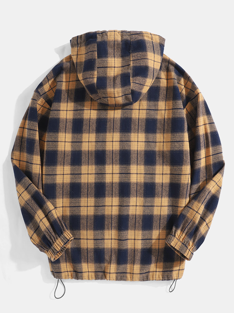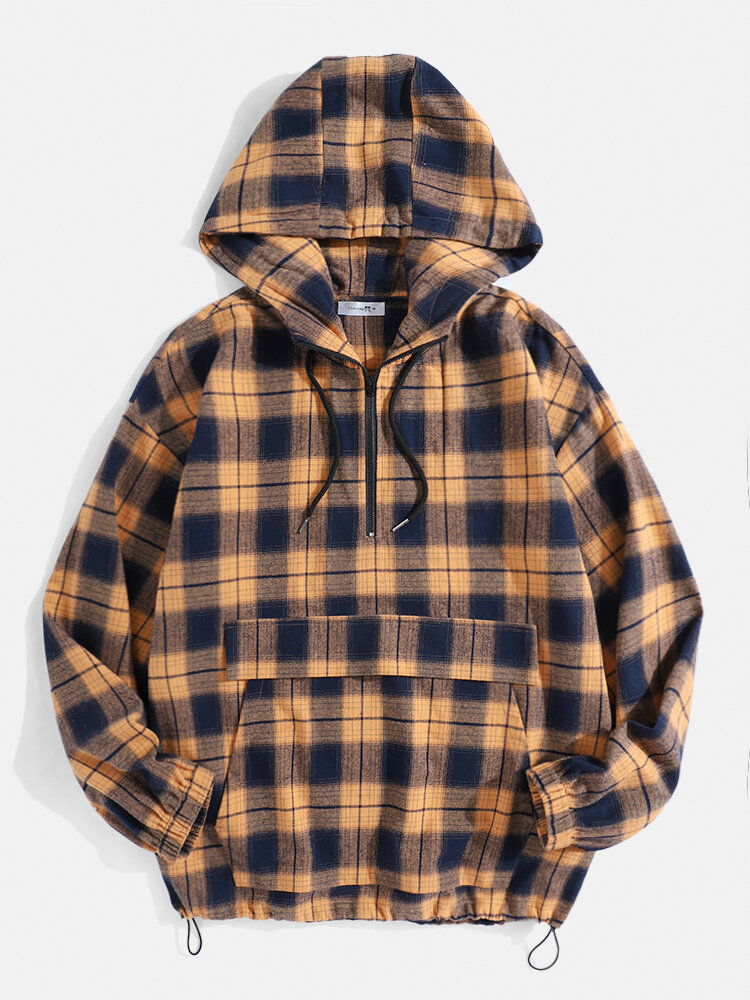 Mens Cotton Vintage Plaid Half Zipper Front Long Sleeve Drawstring Hoodies – Yellow S