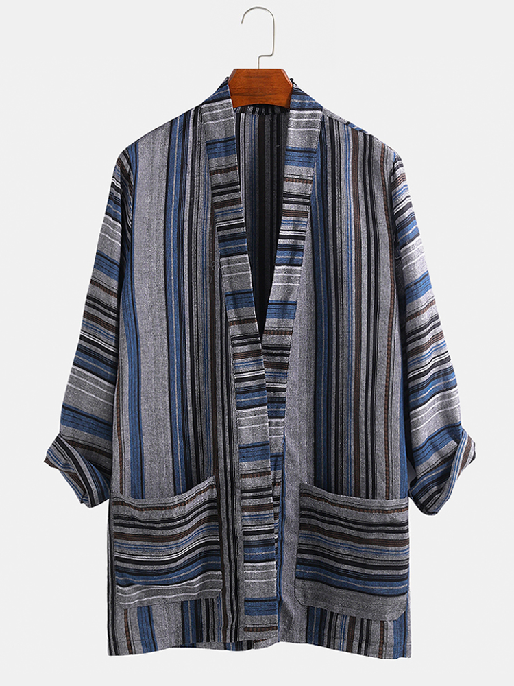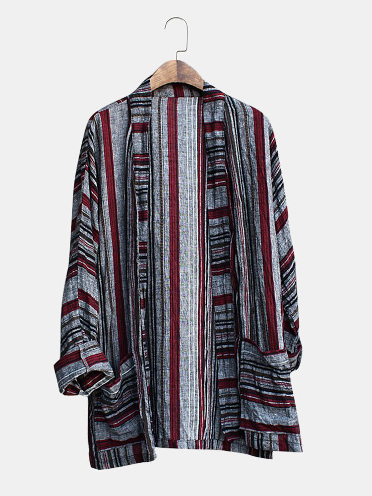 Mens Cotton Vintage Stripe Dual Pocket Kimono Cardigan Shirts – XL Wine Red
