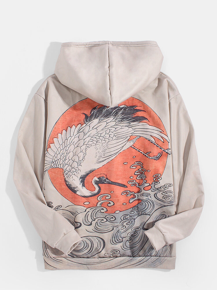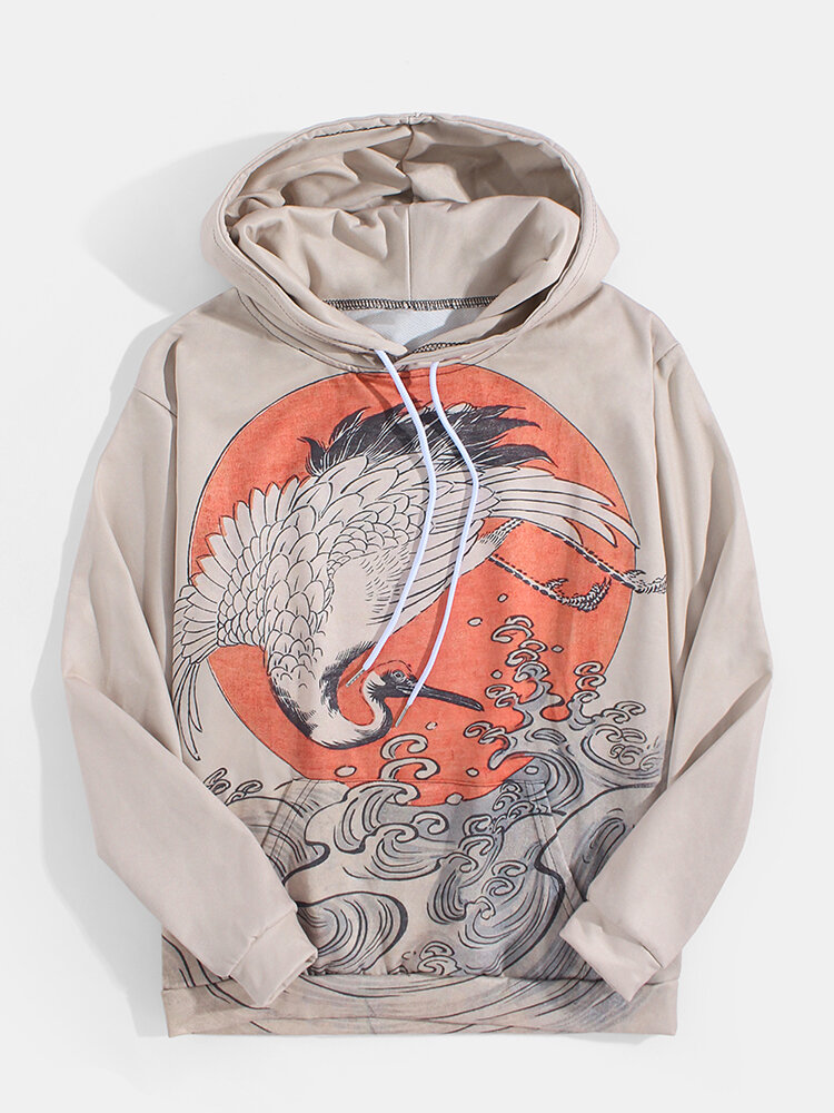 Mens Crant Print Ethnic Style Long Sleeve Ukiyoe Hoodies With Pocket – Apricot M