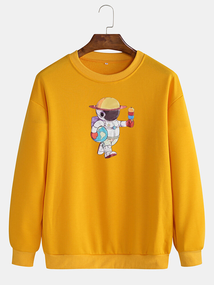 Mens Cute Cartoon Astronaut Graphics Drop Shoulder Pullover Long Sleeve Sweatshirts – Black S