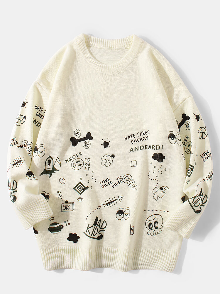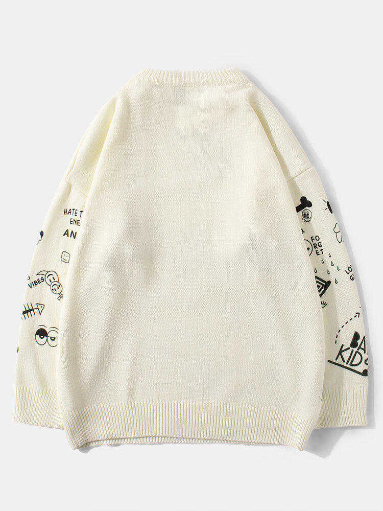 Mens Cute Cartoon Print Round Neck Long Sleeve Knitted Pullover Sweaters – M Yellow