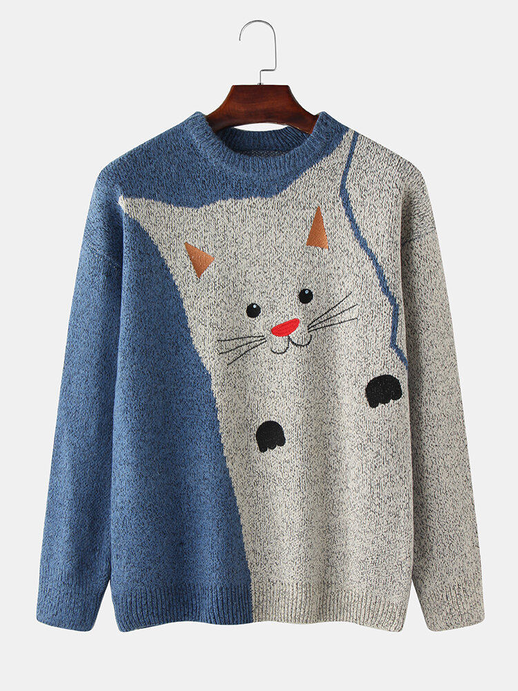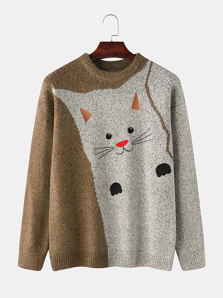 Mens Cute Cat Pattern Knit Crew Neck Casual Drop Shoulder Pullover Sweaters – M Yellow