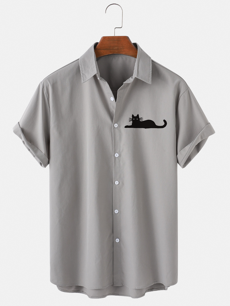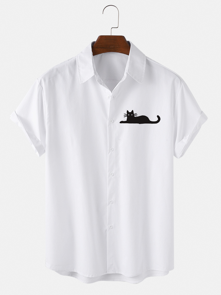 Mens Cute Cat Print Lapel Cotton Casual Short Sleeve Shirts – White S
