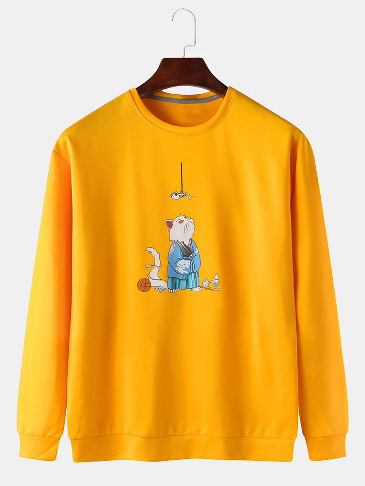 Mens Cute Cat Print Rpund Neck Cartoon Pullover Long Sleeve Casual Sweatshirts – Blue S