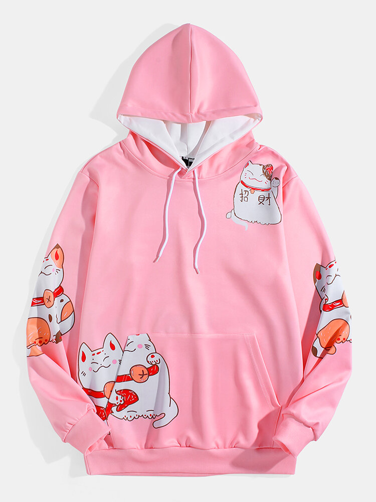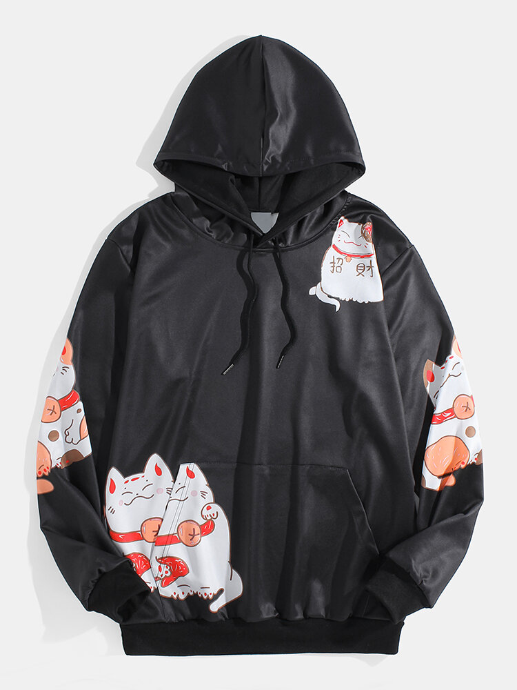 Mens Cute Lucky Cat Print Long Sleeve Kangaroo Pocket Cartoon Drawstring Hoodies – Black S