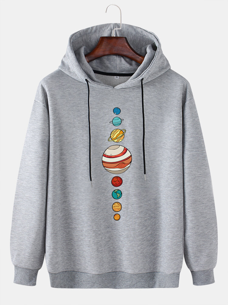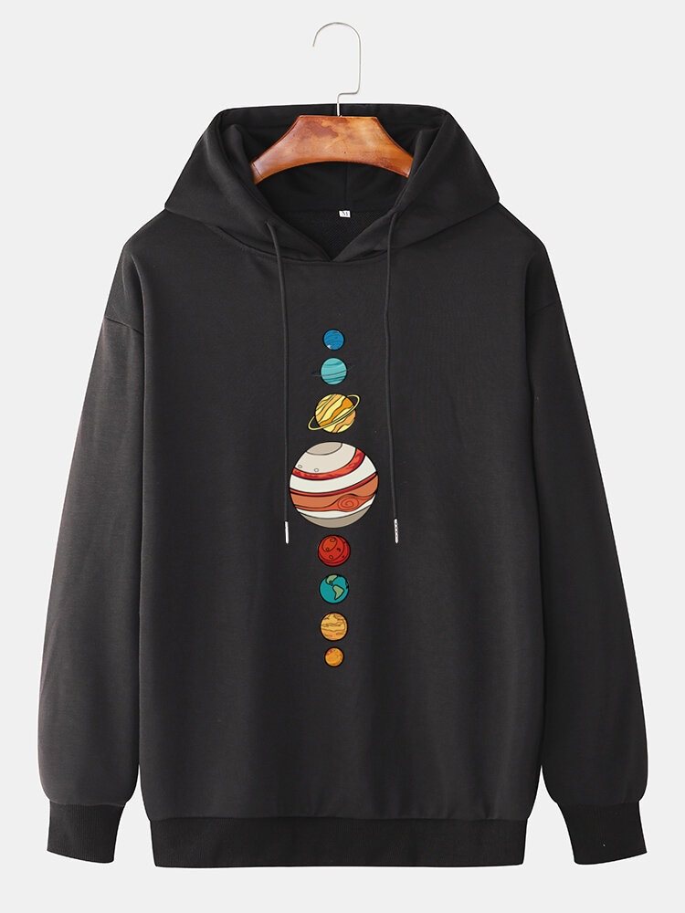 Mens Cute Multi Planet Print Drop Shoulder Long Sleeve Casual Hoodies – Black XL