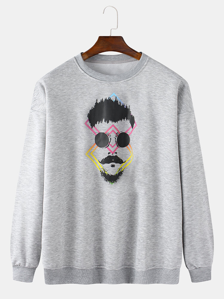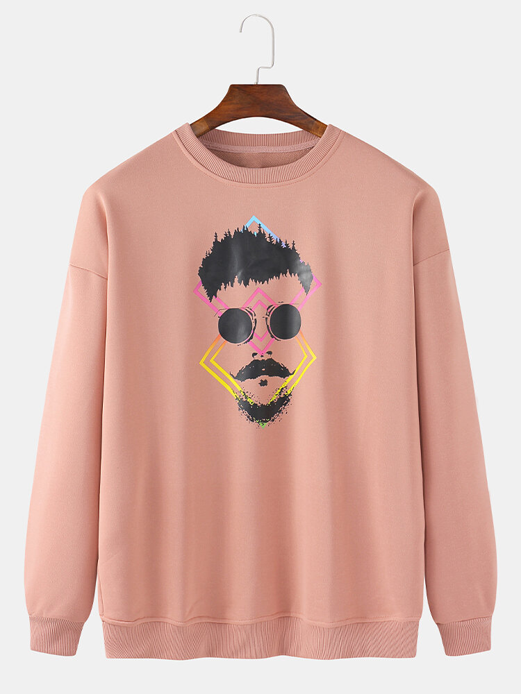 Mens Deisgn Figure Face Print Pullover Cotton Drop Shoulder Long Sleeve Cotton Sweatshirts – Pink L
