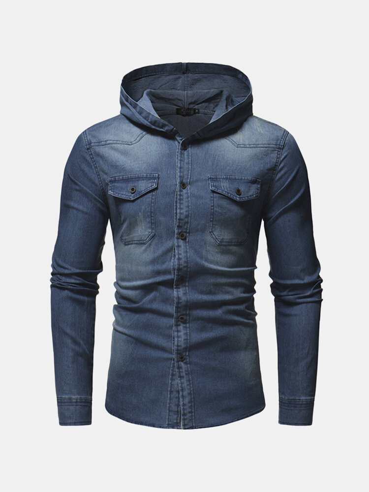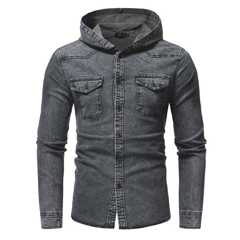 Mens Denim Chest Pocket Cotton Casual Hooded Shirt Jacket – S Black