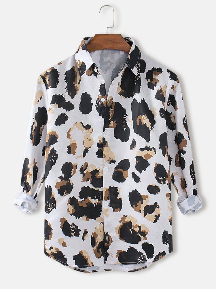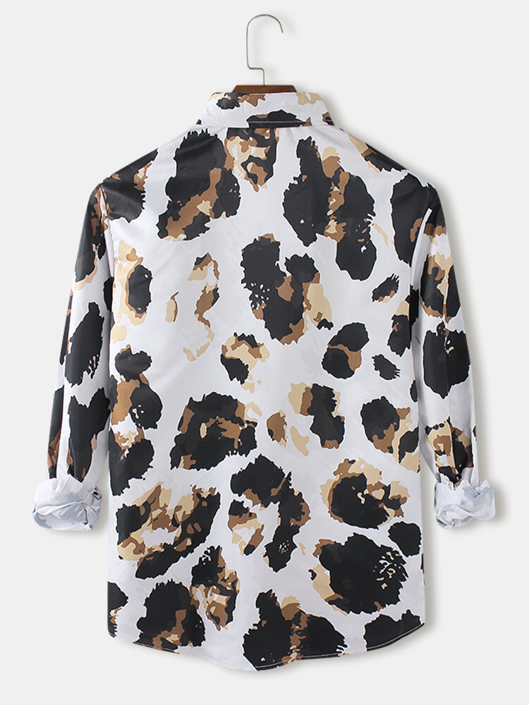 Mens Design Camouflage Print Lapel Collar Long Sleeve Casual White Shirts – White XL
