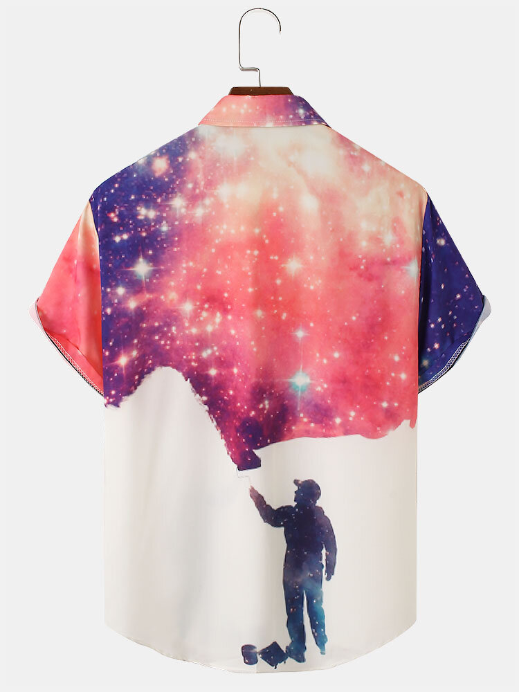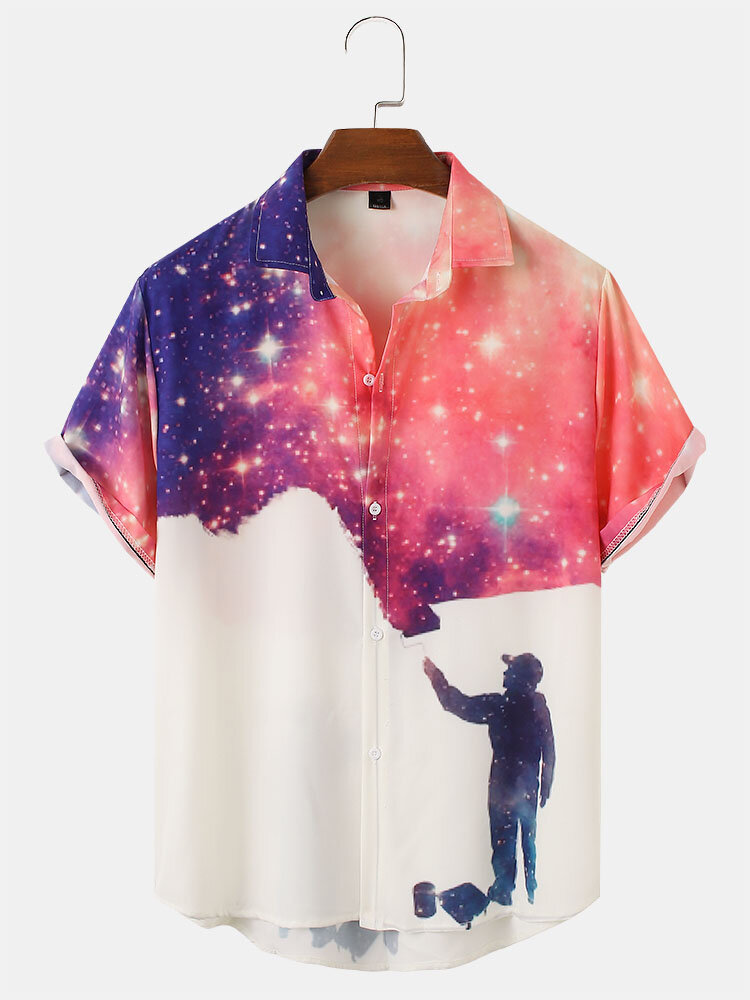 Mens Design Galaxy Print Figure Patterm Lapel Short Sleeve Shirts – White M