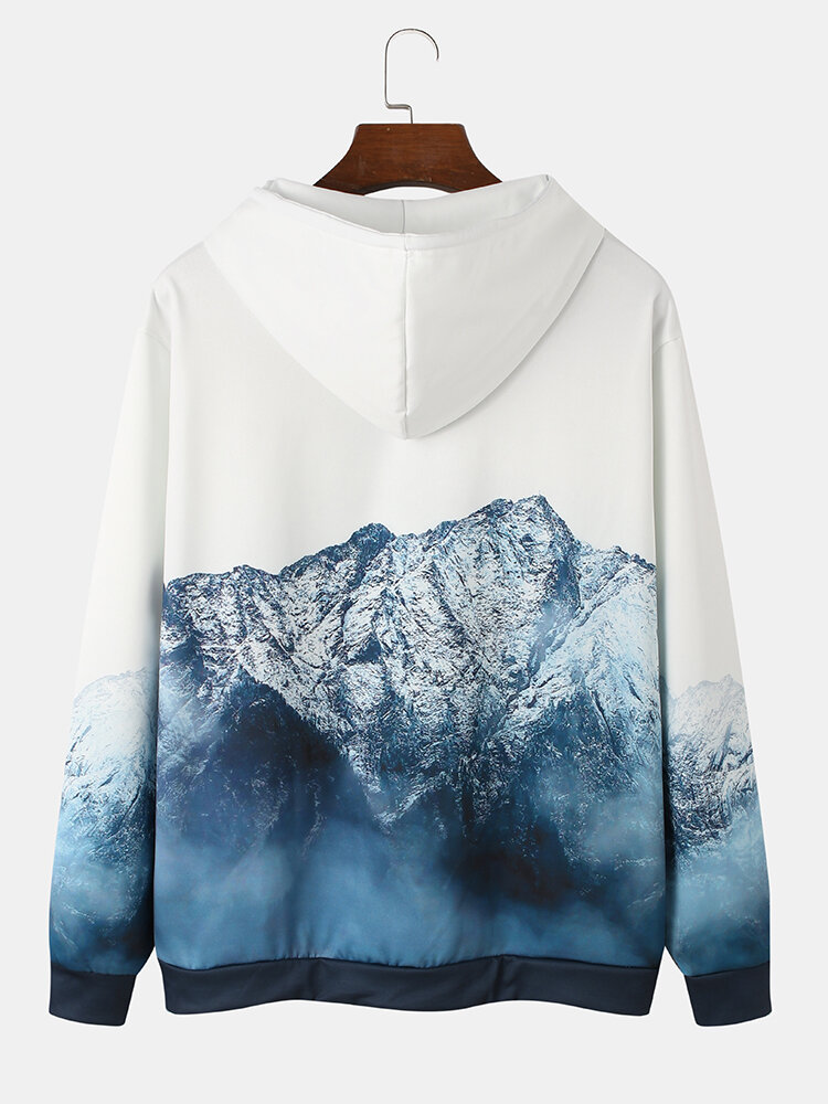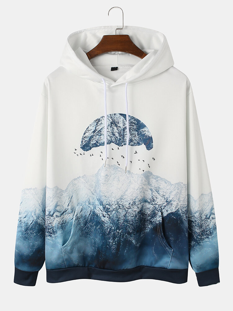 Mens Design Mountain Landscape Print Pocket Drawstring Hoodies – White M