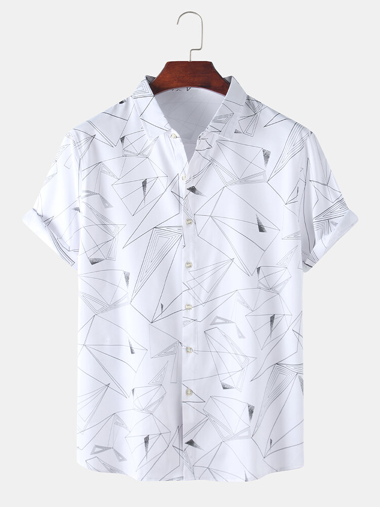 Mens Designer Geometry Print Button Up Casual Short Sleeve Shirts – White 2XL