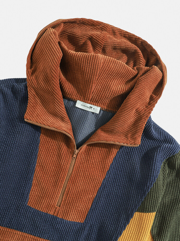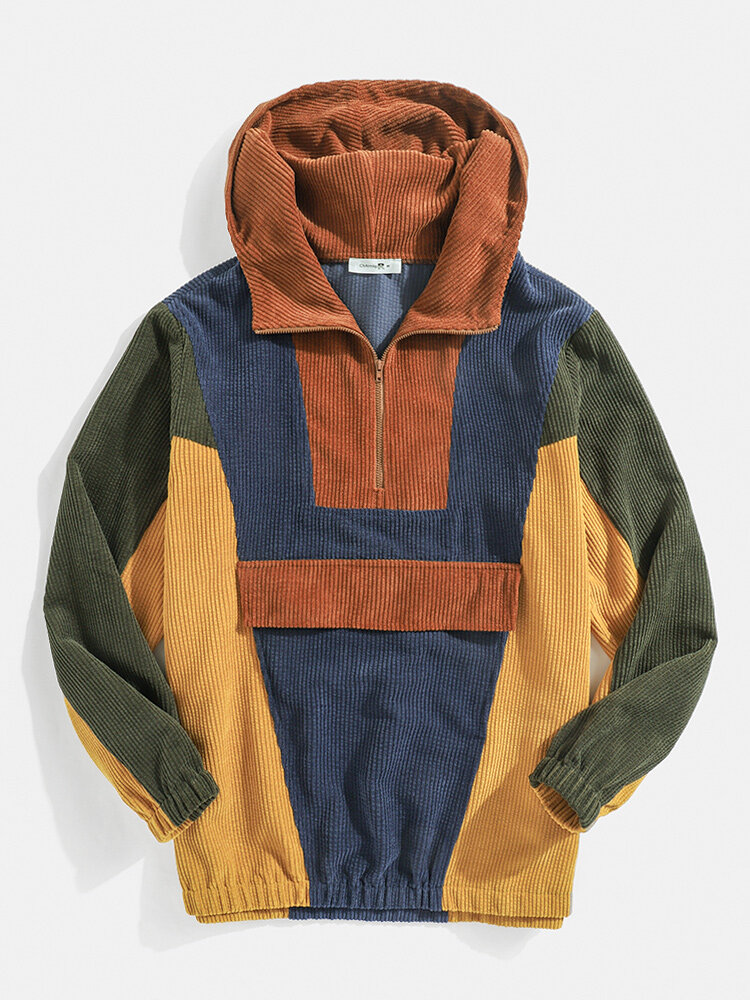 Mens Designer Patchwork Corduroy Half Button Pullover Hoodies – M Blue
