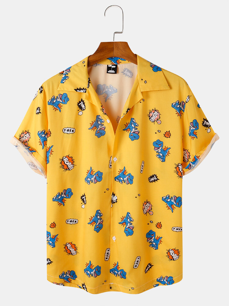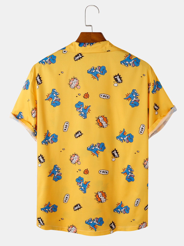 Mens Dinosaur Cartoon Print Revere Collar Loose Short Sleeve Shirts – Yellow M