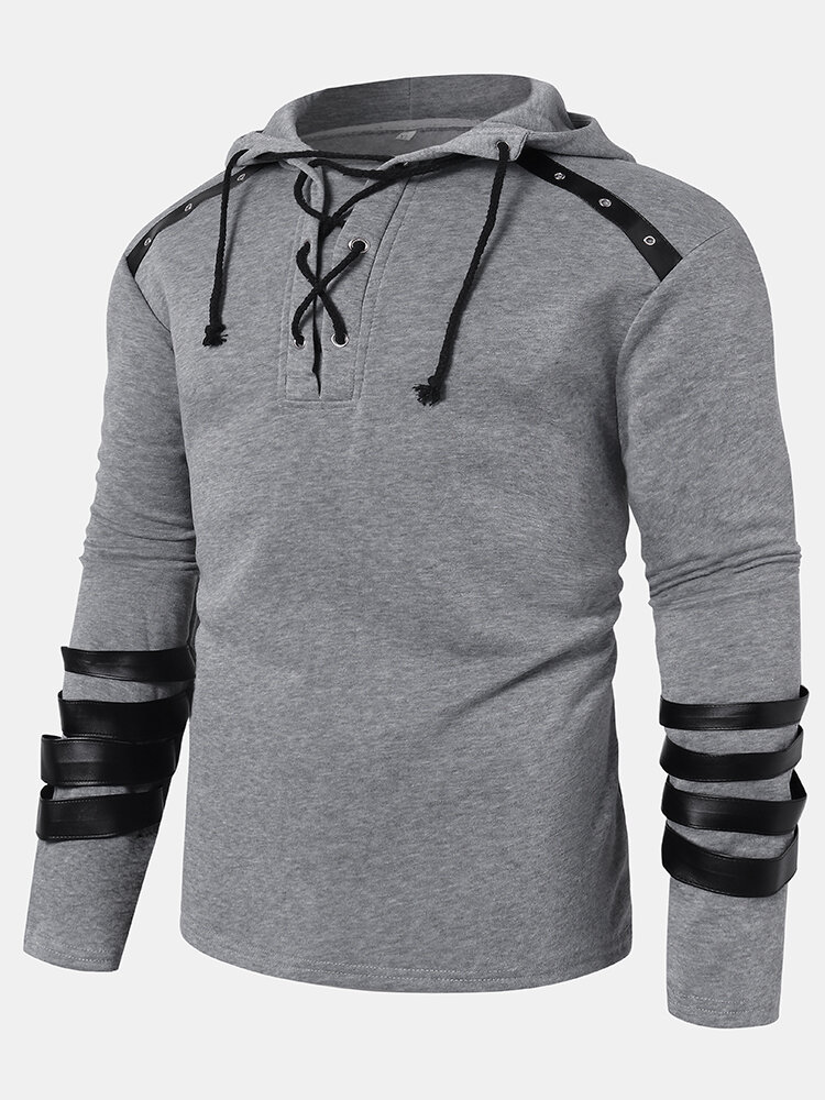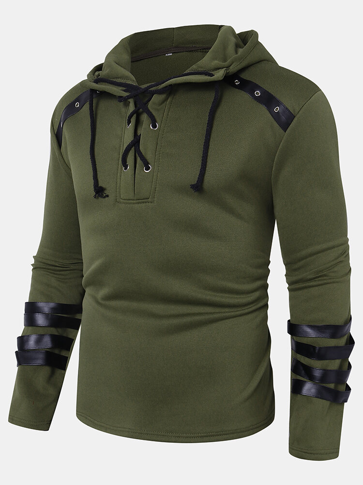 Mens Drawstring Collar Long Sleeve Detail Designer Plain Casual Hoodie – Black M