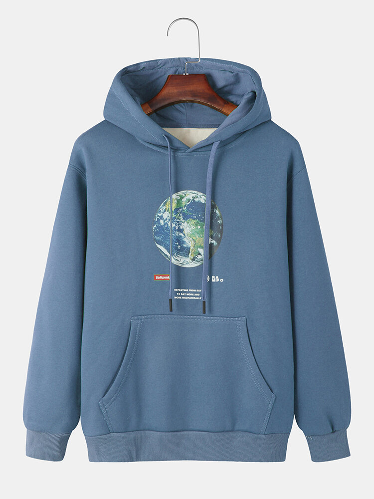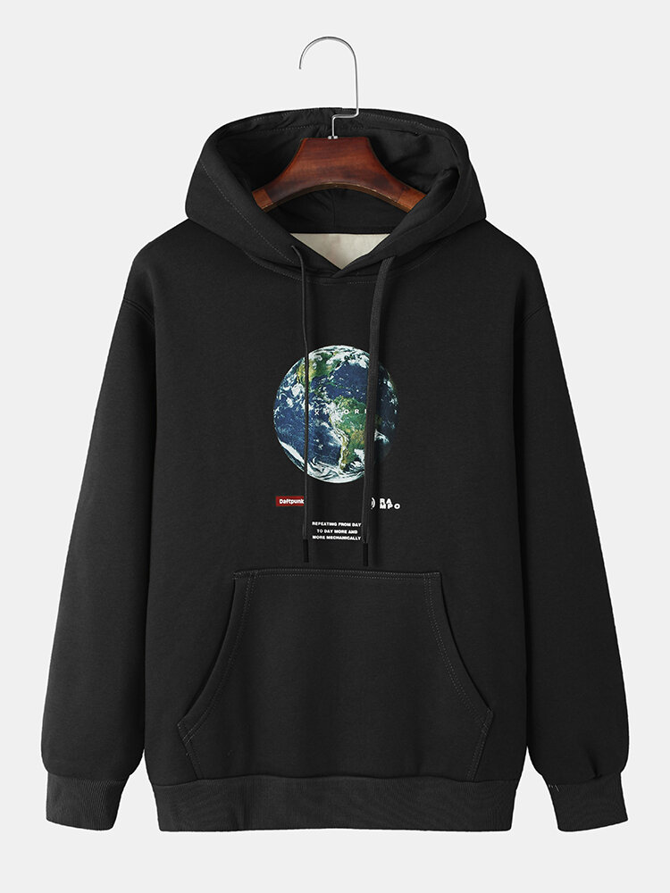 Mens Earth Letter Print Cotton Warm Drawstring Overhead Hoodies – Black M