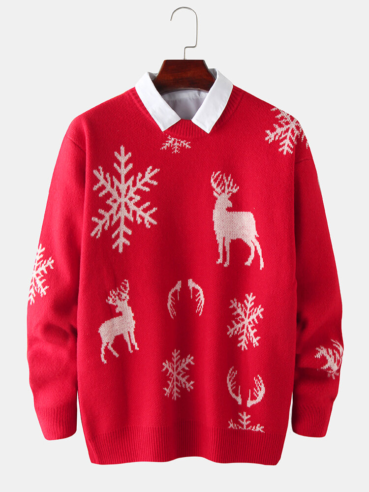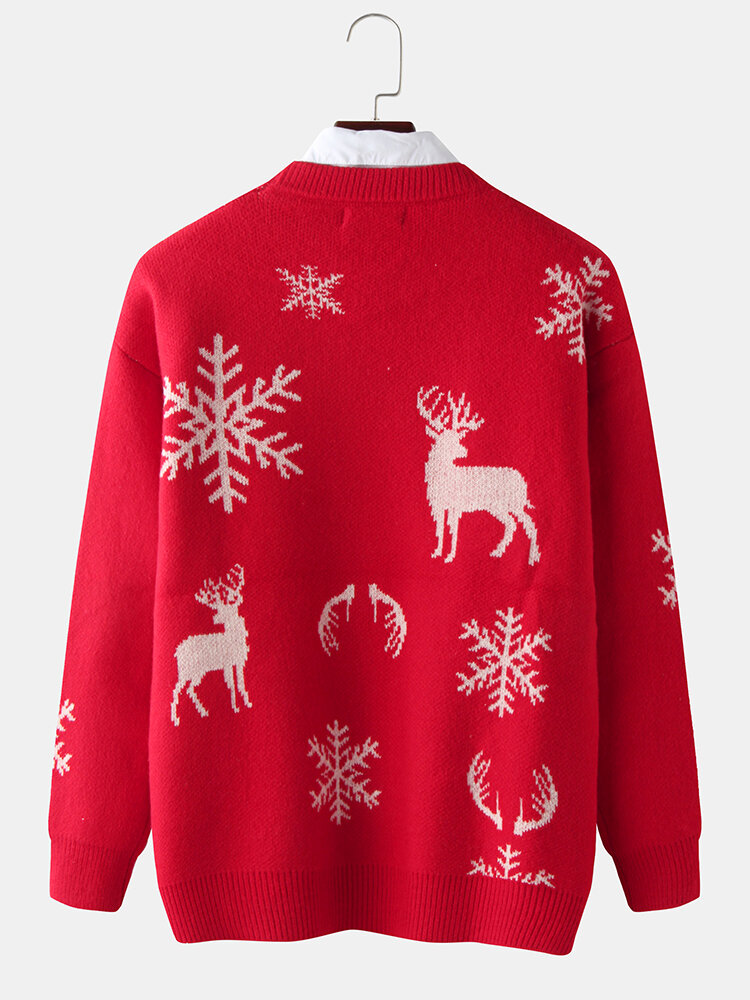 Mens Elk & Snowflake Graphics Knitting Long Sleeve Sweaters – Apricot L