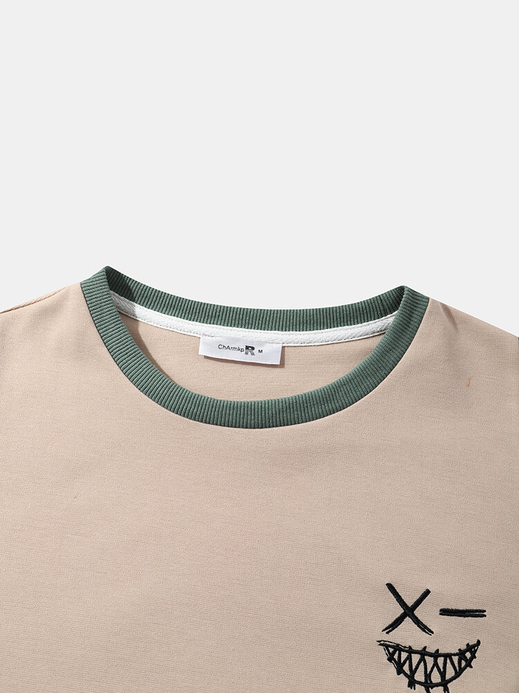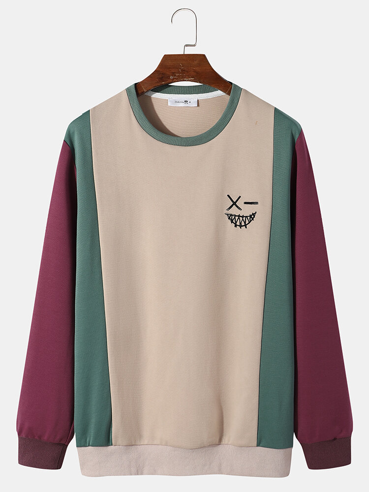 Mens Embroidery Funny Face Patchwork Color Block Sweatshirt – Khaki S