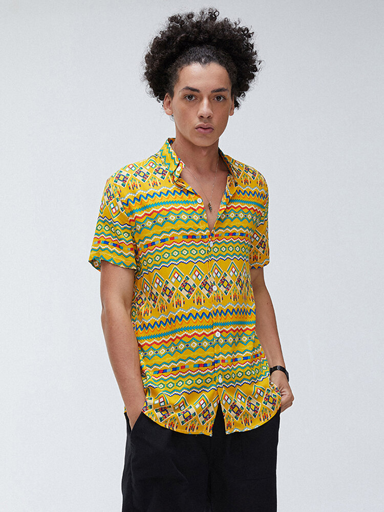 Mens Ethnic African Tribal Print Casual Lapel Short Sleeve Shirts – Navy S