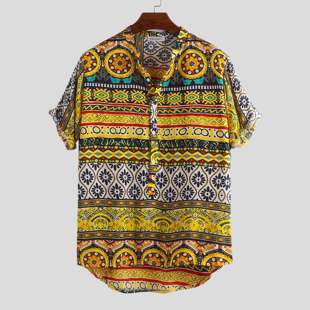 Item Type: Shirts Pattern Type: PrintedGender: Men Fit Type: FitStyle: Casual, Vintage, Fashion Thickness: RegularCollar: Turn-down Collar Season: Spring, SummerMaterial: Rayon Color: Green, Red, YellowCuff Type: Shirt Sleeves Occasion: LeisureSleeve Length: Short Sleeve  Package includes