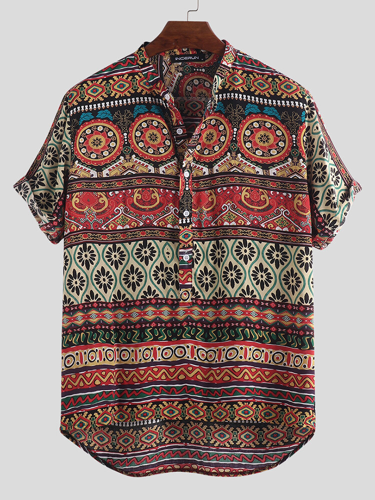 Mens Ethnic Colorful Printed Casual Henley Shirts – XL Green