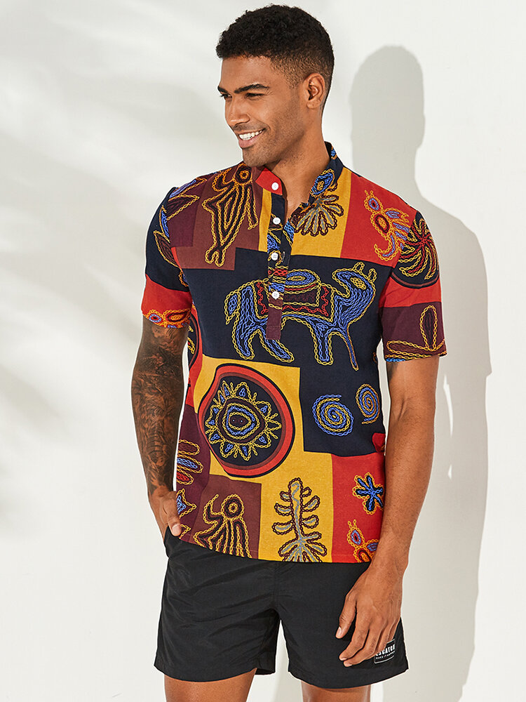 Item Type: ShirtsPattern Type: PrintingGender: MenFit Type: FitStyle: Casual, FashionThickness: RegularCollar: Turn-down CollarSeason: Spring, SummerMaterial: 100% CottonColor: Yellow, Red, Colorful Cuff Type: Shirt SleevesOccasion: LeisureSleeve Length: Short Sleeve