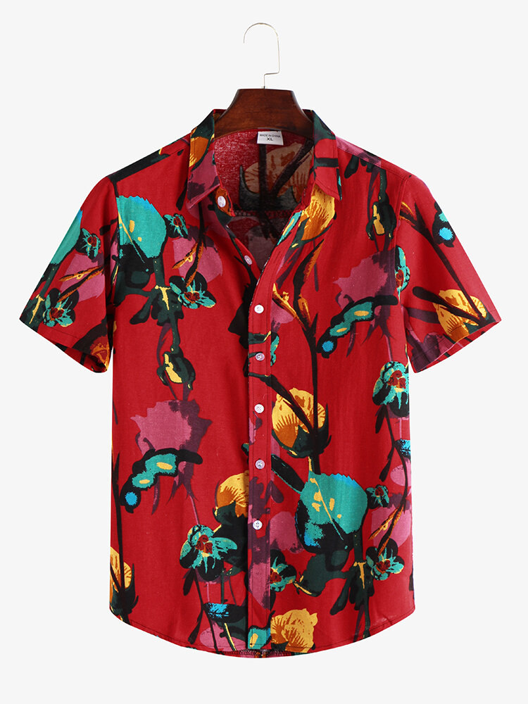 Mens Ethnic Floral Printed Turn Down Collar Casual Shirts – 3XL Red