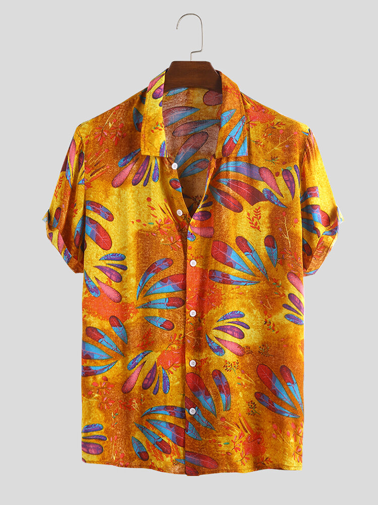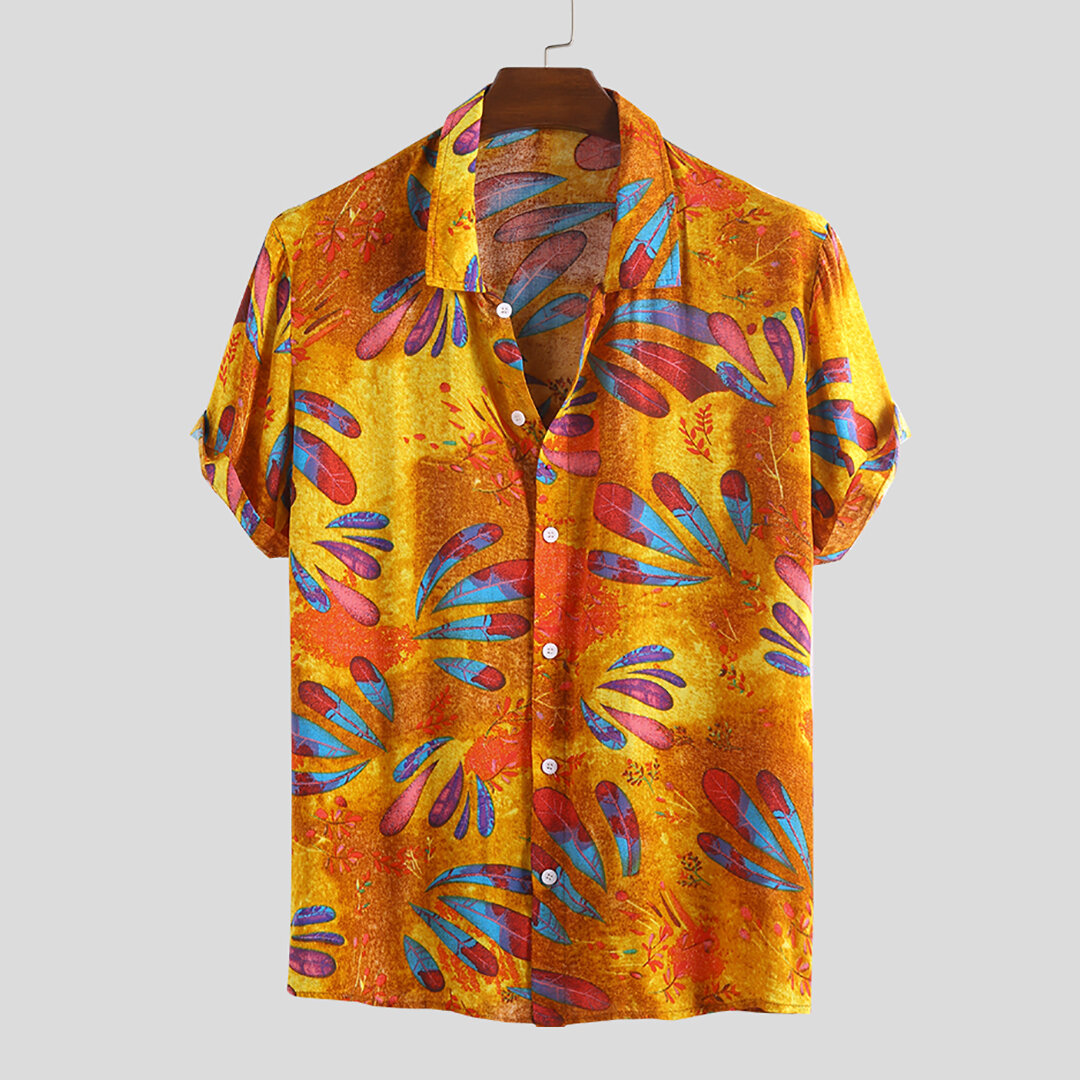 Brand: ChArmkpRItem Type:Shirts Pattern Type: Printied,Floral Gender:Men Fit Type: FitStyle: Casual,Fashion,National Thickness: RegularCollar: Turn-down Collar Season: Spring,SummerMaterial:Rayon Sleeve Length: Short SleeveColor: Red,Green,YellowCuff Type: Shirt Sleeves Occasion: Leisure Package includes