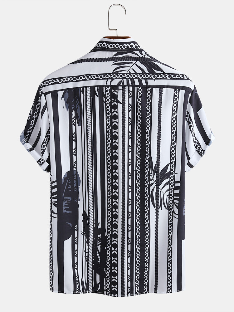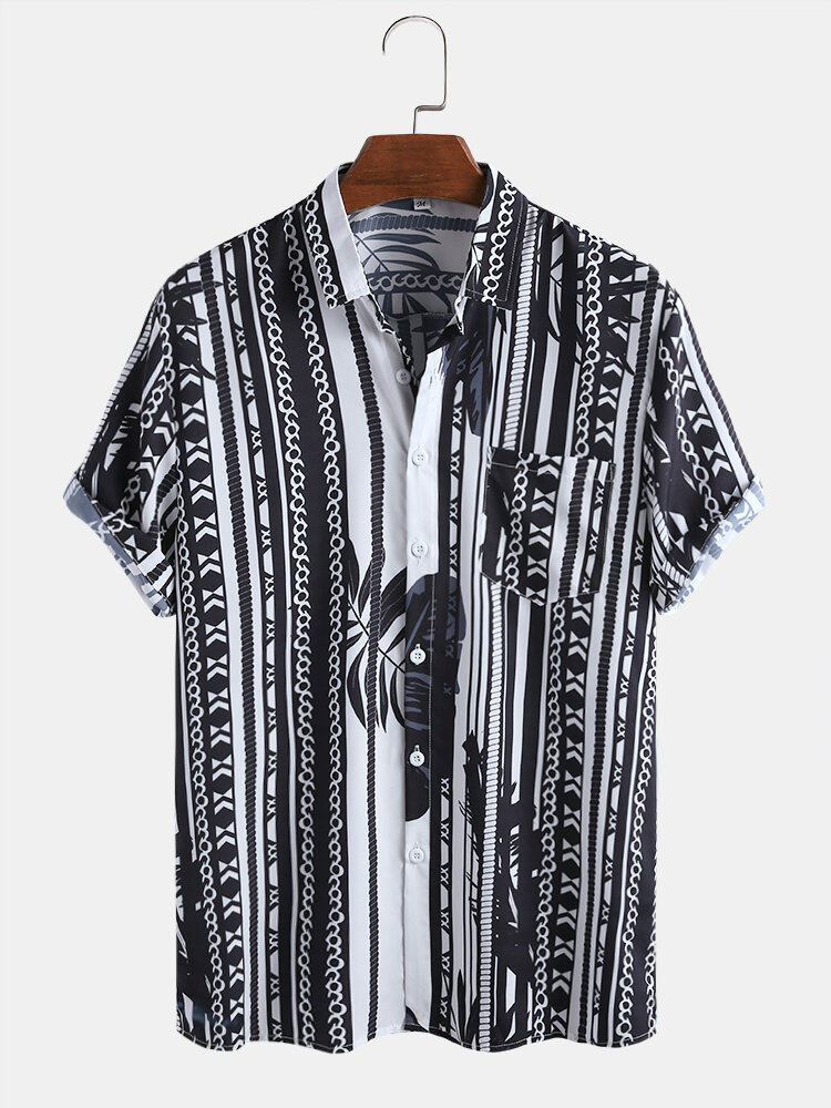 Mens Ethnic Stripe Leaf Print Chest Pocket Short Sleeve Shirts – Black M
