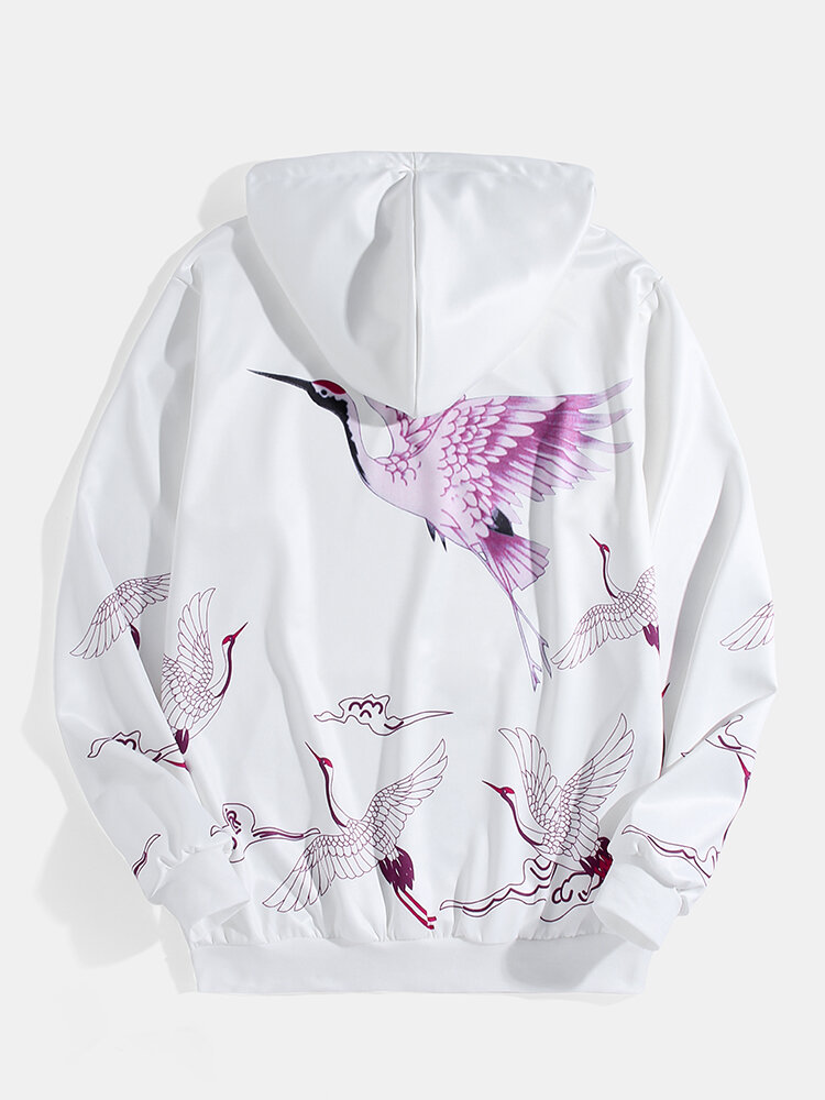 Mens Ethnic Style Crane Print Pocket Long Sleeve White Hoodies – White S
