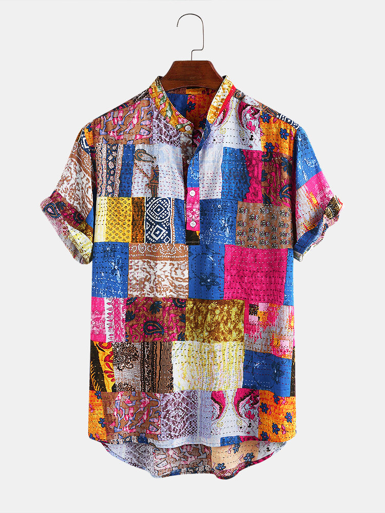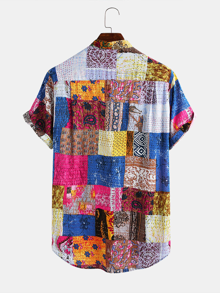 Mens Ethnic Style Multi Patterns Breathable Short Sleeve Casual Shirts – Blue XL