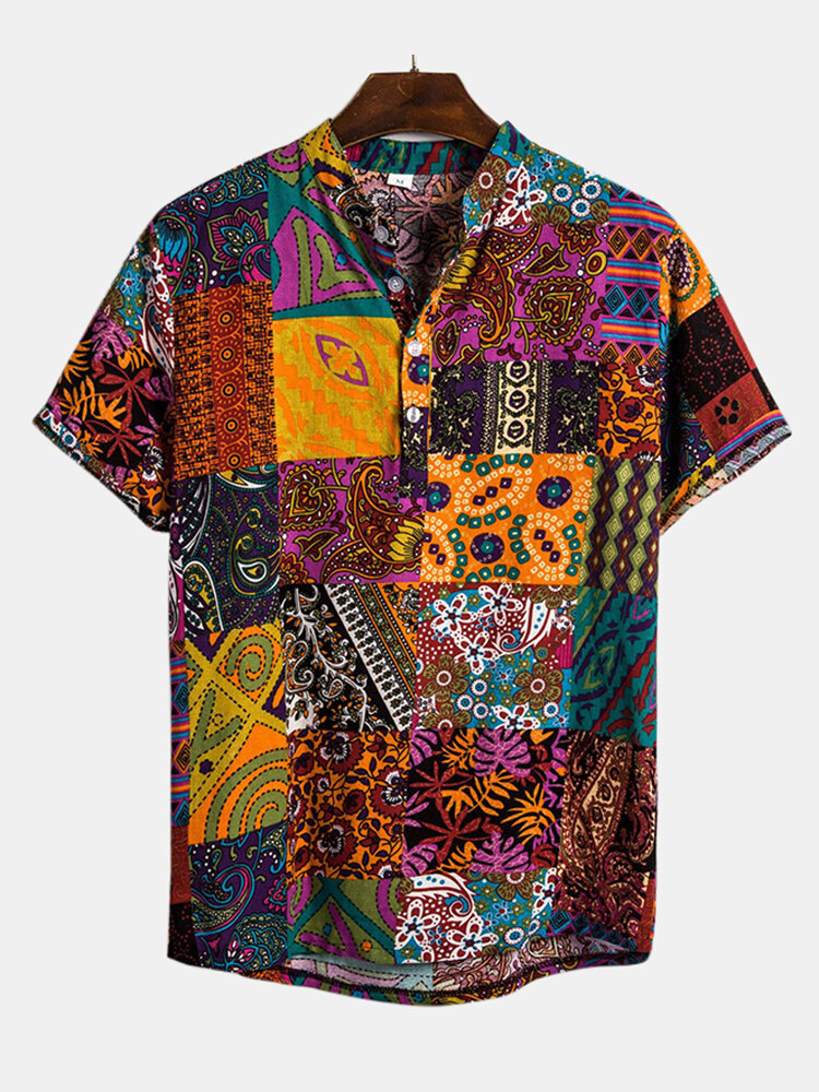 Mens Ethnic Style Patchwork Floral Printing Henley Shirts – 3XL As Picture