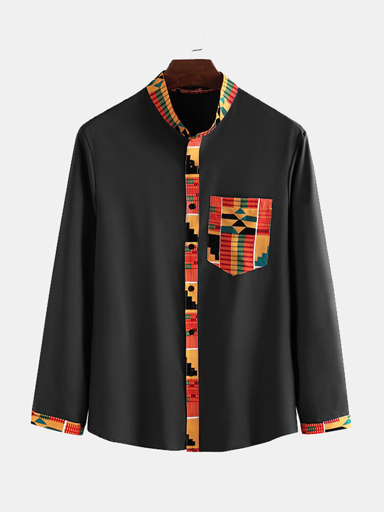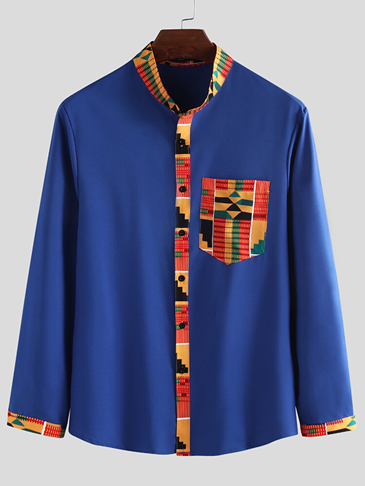 Mens Ethnic Style Pattern Pocket Long Sleeve Casual Shirts – S Blue