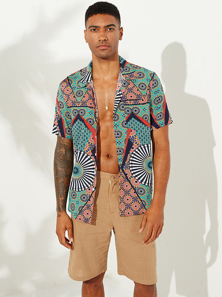 Mens Ethnic Style Pattern Printed Short Sleeve Loose Shirts – 3XL Blue