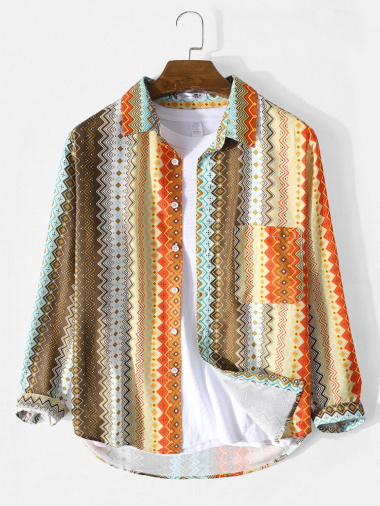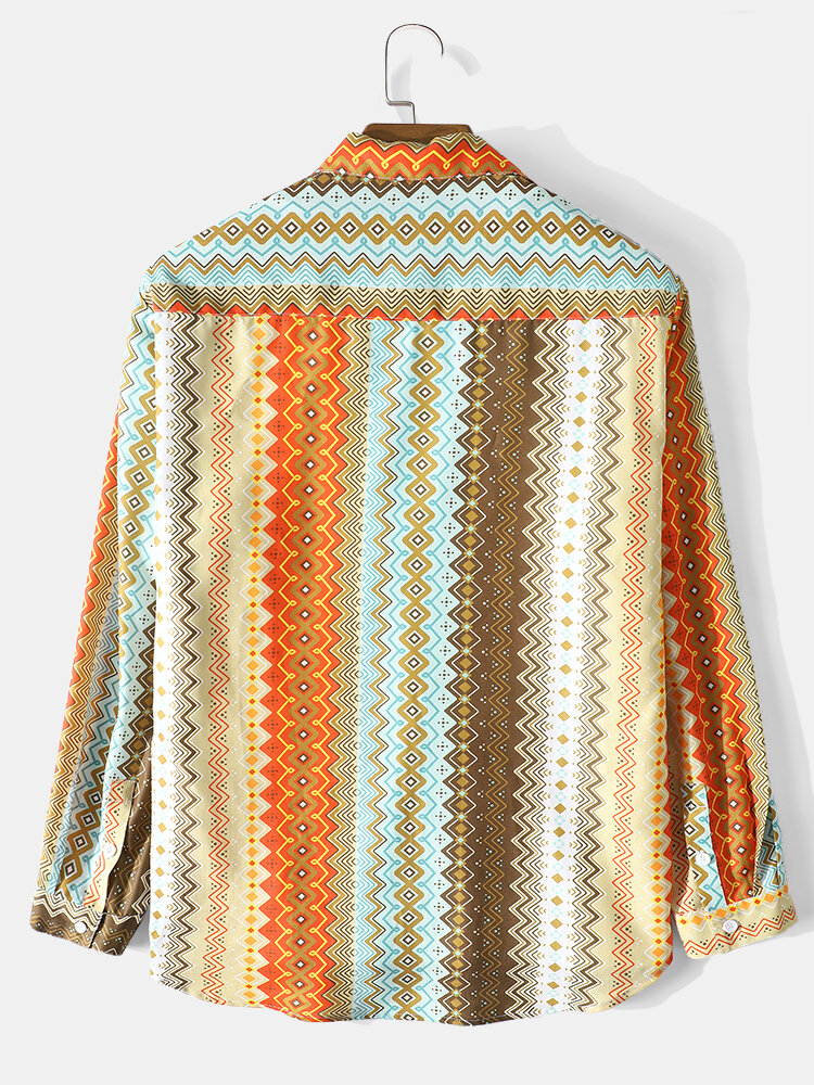 Mens Ethnic Style Print Striped Lapel Long Sleeve Shirt With Pocket – Coffee S