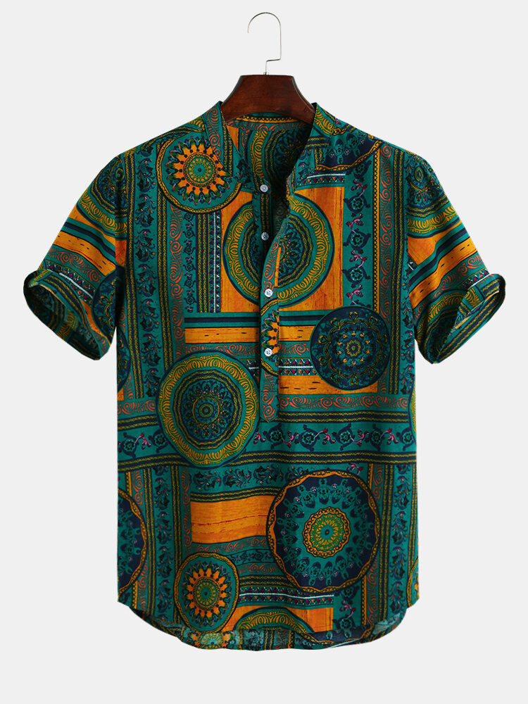 Mens Ethnic Style Printed Breathable Summer Henley Shirts – M Red
